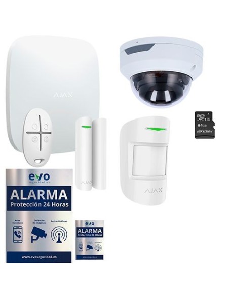 El kit de alarma Ajax está compuesto por un panel de control, un detector volumétrico, un contacto magnético de puerta o ventana, un mando a distancia y una cámara IP Wifi domo con tarjeta de memoria de 64 Gb. Un cartel de aluminio de Alarma Protección 24 Horas de 210 (Al) x 290 (An)mm de Exterior y un vinilo adhesivo laminado polimérico de Alarma Protección 24 Horas de 140 (Al) x 100 (An)mm de uso interior/exterior.